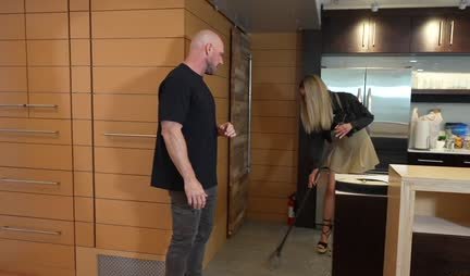 Блондинка в короткой юбке умело сосет ствол на кухне