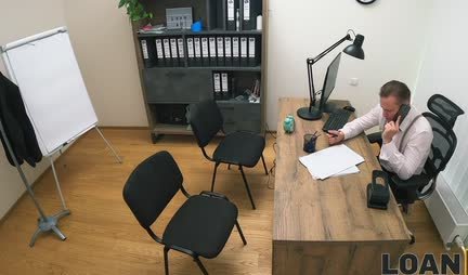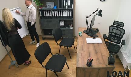 Вполне себе красивая блондинка пришла в банк и заявила что нуждается в кредите. Менеджер приложил все усилия к тому, чтобы подготовить бизнес план с красавицей и соблазнить ее прямо на секс в офисе. Ну и если поначалу она отдавалась вообще без эмоций, то потом вошла во вкус и долго не хотела уходить!